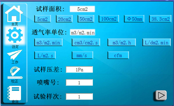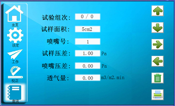 3、內置7種測試單位mm/s、m3/m2.min、cm3/cm2.s、m3/m2.h、cfm、L/dm2.min、L/m2.s,